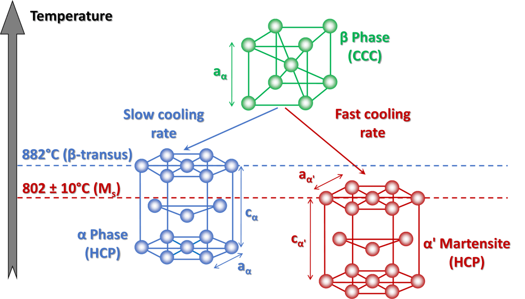 In titanium, β-α phase transition, which is schematically illustrated in Figure 1, occurs during cooling from high temperature only if the cooling rate is slow enough to allow the transport of atoms by diffusion, thus determining the transformation of CCC lattice of β-phase into HCP lattice of α-phase.