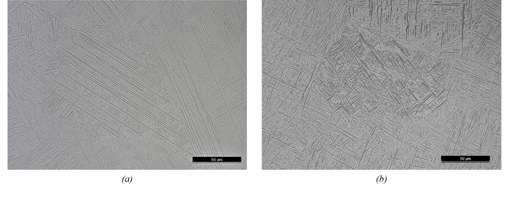 Speaking of morphology, also for titanium α’ martensite occurs in two variants, which can often coexist even in the same component, defined respectively as “lath martensite” and “plate martensite”, whose appearance under light microscope is shown in Figure 2 for Ti-6Al-4V alloy.