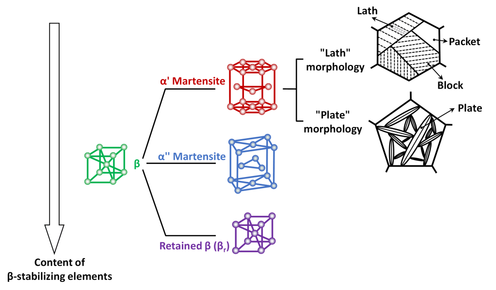 In some titanium alloys, the presence of another martensitic microstructure with orthorhombic crystal lattice, called α” (or “alpha double prime”), has also been found. As a general rule, the transition from α’ to α” martensite is determined by the content of β-stabilizing elements in the specific alloy, raising the content of β-stabilizers promotes the formation of α” instead of α’. Furthermore, as it can be seen in Figure 3, if the content of β-stabilizing elements is particularly high, martensitic transformations are completely suppressed and after quenching β-phase remains at room temperature in a metastable condition, which is commonly reffered to as beta retained (or βr).