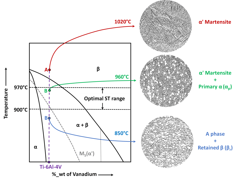 On the other hand, if solubilization trating temperature were too low, β phase would be so enriched in β-stabilizing elements (V in the case of Ti-6Al-4V) that the martensitic transformation during cooling would not be possible; in this case the microstructure would be made up of α phase grains with retained β (or βr) and subsequent aging would inevitably produce a very modest increase in hardness, resulting of no practical interest.