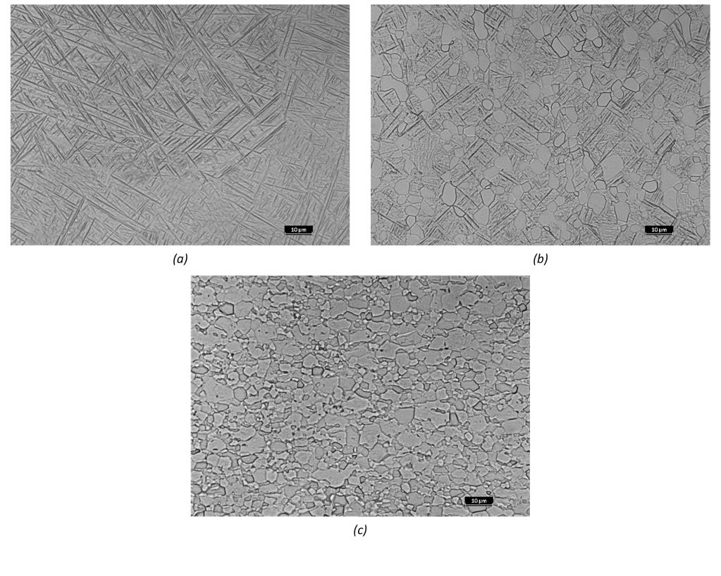 (a) 1020°C: the microstructure consists of only α’ martensite; (b) 960°C: equiaxed grains of primary alpha (αp) in a matrix of α’ martensite; (c) 850°C: grains of alpha phase with a small amount of retained beta (βr).