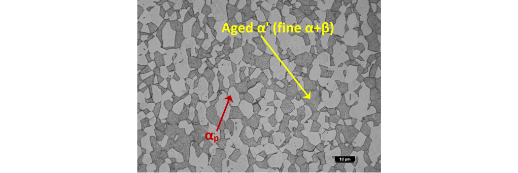 For this reason, solution treating is therefore carried out at temperatures lower than β-transus, in the specific case of Ti-6Al-4V alloy between 900 and 970°C; consequently, at the end of cooling, the microstructure consits of a matrix of hexagonal α’ martensite containing ewgular equiaxed grains of α phase, called primary alpha, or αp, whose amount decreases with increasing of solution treating temperature, until it ideally vanishes when the treatment temperature reaches β-transus tmeprature. This condition represents the targeg to be obtained after proper solution trating, as it allows the achievement of the best possible compromise between hardness, ductility and toughness after subsequnt aging.