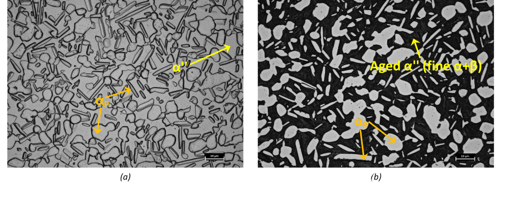 (a) after solubilisation at 850°C: microstructure consisting of primary α with both globular and elongated shape in matrix of orthorhombic martensite α”; (b) like the previous one after subsequent aging at 695°C for 4h: the martensitic matrix was transformed into a mixture of α and β (aged α”) with sub-microscopic dimensions.